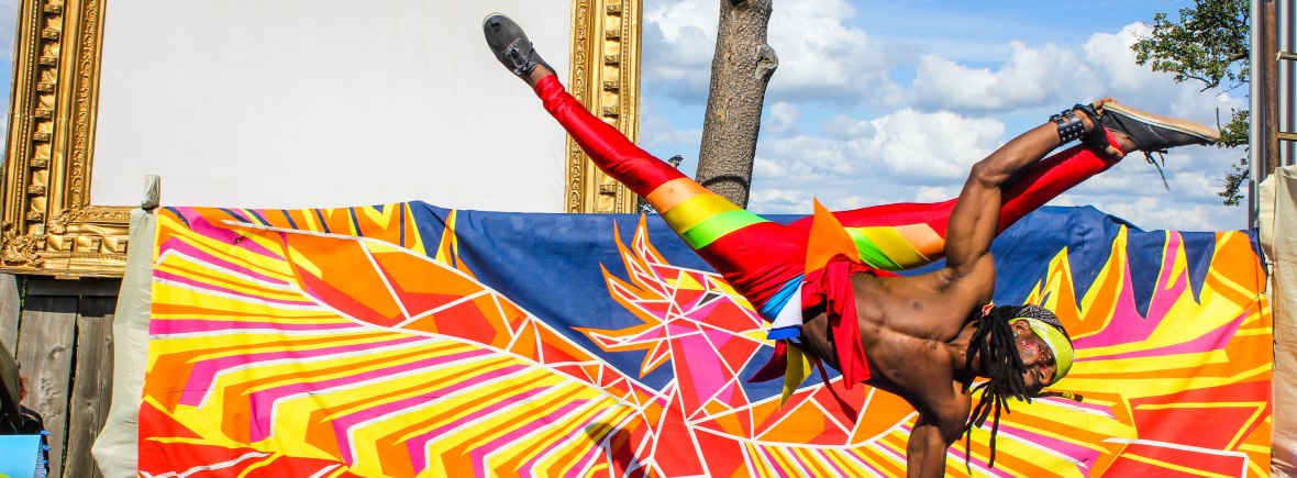 His performances take on another dimension when he performs with other members of African Power Acrobatics circus. He has up to ten UK based acrobats, drummers and dancers who he works with on a regular basis. He has also performed with a brass band, a steel pan band, a burlesque dancer and a number of circus companies!
